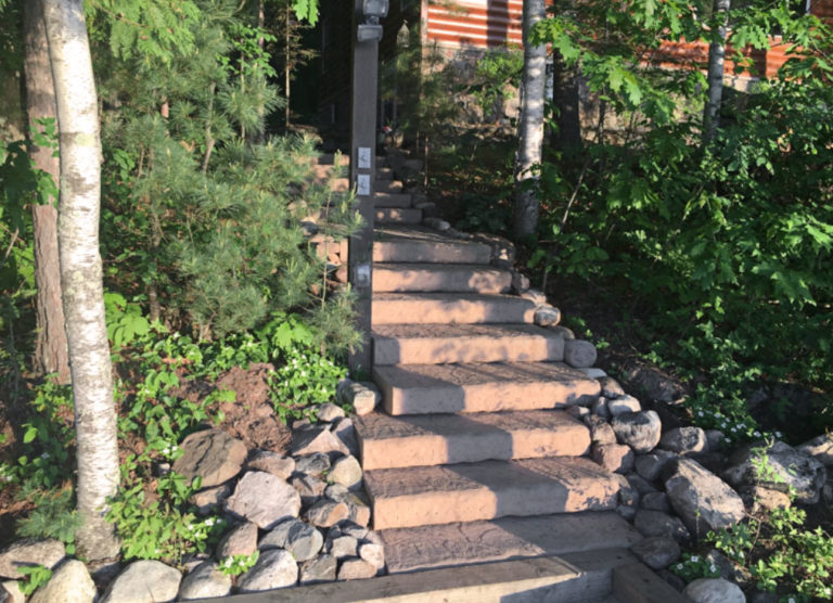 Reesmans provided a safe and accessible walkway from the house to the lake landing area. A natural stone look was used that blended in with the north woods surroundings. Railings and final planting pictures to be provided in the spring.
